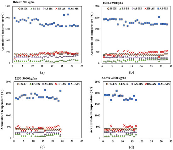 Differences in accumulated temperature at different growing stages for different quinoa genotypes with a yield of (a) below 1500 kg ha−1, (b) 1500–2250 kg ha−1, (c) 2250–3000 kg ha−1, and (d) above 3000 kg ha−1.