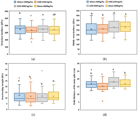 The average stem-breaking strength ranges from 11.42 to 12.45 kPa (Figure 5c). The highest stem-breaking strength was for the yield level of GY1 and was significantly higher than for GY2, GY3, and GY4. The average stem-breaking strength of GY2, GY3, and GY4 was 8, 6.3, and 8.2% less than GY1, respectively.