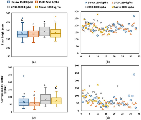 Differences in plant height (a,b) and aboveground dry weight (c,d) of quinoa genotypes with different yield levels. Different letters indicate significant differences using the Tukey HSD test (p ≤ 0.05).
