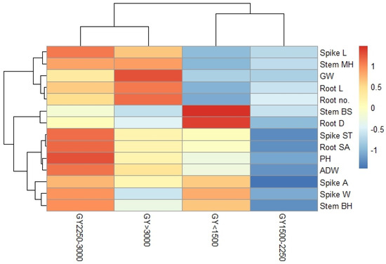 Heatmap clusters and a dendrogram of the traits were drawn for the different yield categories (Figure 8). The dendrogram showed the close clustering of yield groups of GY3 and GY4 and a similar clustering of GY1 with GY2. Among the variables, the panicle length is clustered with stem center hardness, the root length is clustered with the number of root tips, the plant height is clustered with aboveground dry weight, and the panicle weight is clustered with stem base hardness and panicle area. Most of the variables have the lowest values for grain yield categories GY1 and GY2, while grain yield category GY3 showed the highest values.