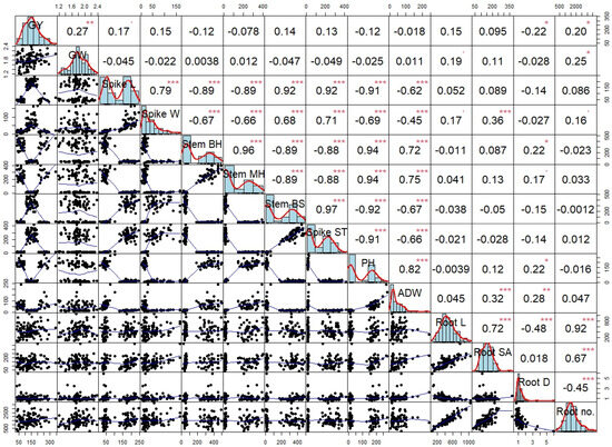 Correlation matrix of all growth, stem hardness, and yield traits of quinoa germplasms. ADW: aboveground dry weight; GW: grain yield; GW: grain weight; PH: plant height; Root D: root diameter; Root SA: root surface area; Root L: root length; Root no.: number of root tips; Stem BH: stem base hardness; Stem MH: middle stem hardness; Spike L: panicle length; Spike W: panicle width; Spike A: area of the panicle; Spike ST: stalk thickness of main panicle; Stem BS: stem breaking strength. *, **, and *** indicate significance at 0.001, 0.01, and 0.05 probability levels, respectively, by Pearson correlation.