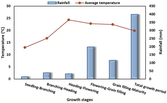 The rainfall and average temperature at the experimental area during the growth stages of quinoa. The seedling, branching, heading, flowering, grain filling, and maturity stages commenced on 16 May, 30 May, 11 June, 23 June, and 9 August 2021, respectively.