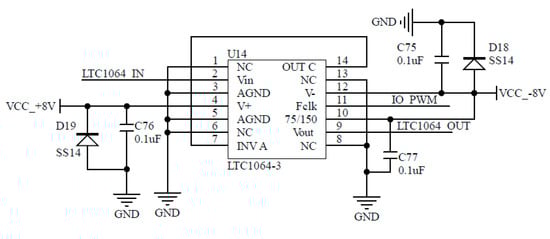 The original signal of the multispectral crop growth sensor still contains low-frequency noise signals after being processed by the front filtering buffer circuit. Some noise signals of different frequencies will be mixed with the original signal in the process of I-V conversion and amplification performed in the front stage. Therefore, it is necessary to filter the signal once again in the rear-stage circuit so as to improve the accuracy of the acquired signal. In the process of designing a conventional filter, the cut-off frequency is set at first, and then the filter parameters are solved. The filters designed using this design method mostly have low accuracy, and their cut-off frequency cannot be changed. Because of these deficiencies, we designed a program-controlled filter circuit based on the LTC1064-3 filter produced by Analog Devices, as shown in Figure 4. A PWM signal with a duty cycle of 50% is generated through proper settings of the frequency division coefficient and automatic reloading coefficient of the general-purpose timer in the STM32429ZET6 chip, and the PWM signal is passed to pin 11 of the LTC1064-3 chip to provide the clock signal of the filter. The cut-off frequency of the LTC1064-3 filter is set to 5 Hz to enable the generation of the 750 Hz PWM signal.