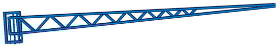 To overcome the impact of vibration of agricultural machinery on the sensing accuracy and performance of crop growth sensors, we designed a truss-type sensor bracket based on the principles that can be used to improve the dynamic characteristic parameters and vibration parameters of the sensor bracket. Considering that the support system is a long cantilever beam, it is necessary to enhance the overall structural stiffness. Based on experience, we chose a reinforced triangular structure. The rods used to make the plane truss of the new sensor bracket have a rectangular cross-section; that is, they are made of square steel. The truss adopts a trapezoidal structure. The web members are arranged in the fully inclined form, with an inclination angle of 45°. The steel material used to make the sensor bracket is Q235 steel. Its specifications are as follows: Poisson’s ratio: 0.3; elastic modulus: 2.068 × 105 Mpa, material density: 7850 kg/m3, tensile strength: 375–460 MPa, yield limit: 235 MPa, and allowable stress: 117.5 MPa. The new sensor bracket has a length of 4 m, and its allowable bending is 4000 × (2/500) = 16 mm. The structure of the truss-type sensor bracket is shown in Figure 5.