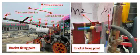 Eight micro piezoelectric triaxial acceleration sensors were fixed to the assembly frame (used for fixing the sensor bracket to the experimental agricultural machine) of the experimental agricultural machine and different positions of the conventional cantilever bracket were used to measure the vibration frequency and vibration amplitude of the experimental agricultural machine as a single excitation source as well as the vibration frequency and vibration amplitude values at different positions of the conventional cantilever bracket. The specific installation positions are shown in Figure 6 and Table 1. The engine of the experimental agricultural machine was working during the test.