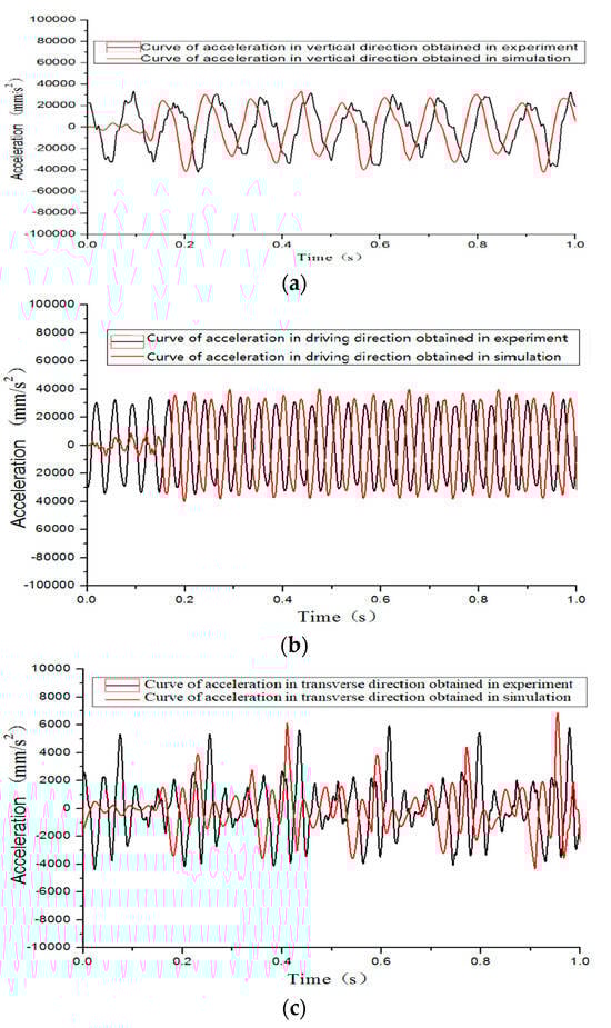 To verify the accuracy of the finite element simulation results of the sensor bracket, we compared and analyzed the time domain response curves of acceleration in three directions of the bracket tail end (M8) based on the data of vibration testing and finite element simulation. It can be seen from Figure 8 that the period and amplitude values obtained through simulation are basically consistent with the values obtained through vibration testing; the values of the maximum and average relative errors of their amplitude are shown in Table 2. In the vertical, driving, and transverse directions, the maximum relative errors are 0.22%, 0.16%, and 0.92%, respectively, and the average relative errors are 0.06%, 0.15%, and 0.32%, respectively. This indicates that the finite element model of the sensor bracket established in this study has good simulation accuracy.