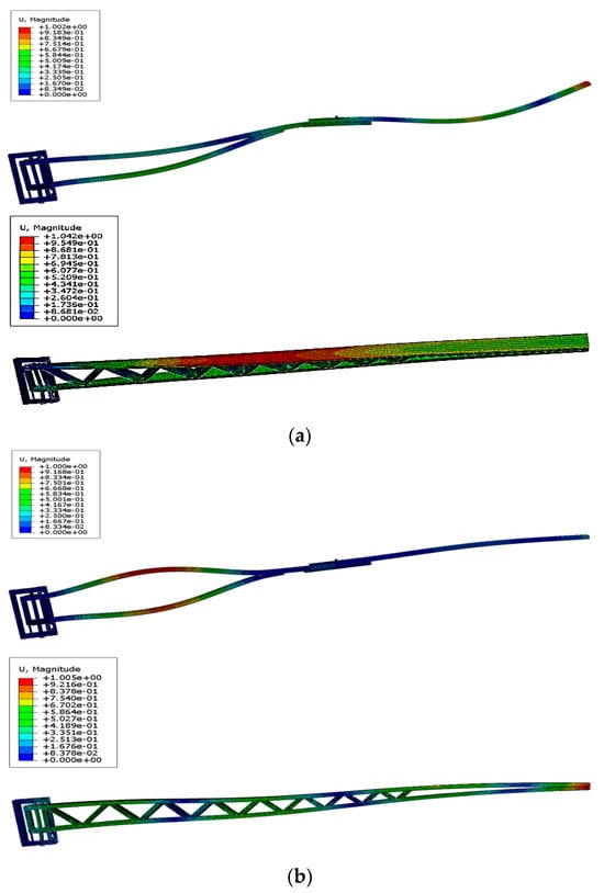 Comparison of main vibration modes between truss-type and cantilever bracket. (a) Comparison of 7th order vibration modes. (b) Comparison of 8th order vibration modes.