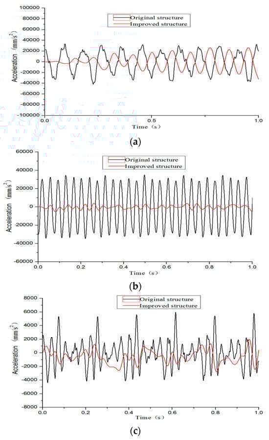 Figure 10 shows the curves of the acceleration response (three directions) at the far end of the truss-type sensor bracket and the cantilever sensor bracket, obtained through finite element simulation. The curves indicate: (1) the acceleration responses of the two sensor brackets have roughly the same periodicity; (2) while there is only a small amplitude difference between the acceleration responses of the two sensor brackets in the vertical direction, the acceleration amplitude of the truss-type sensor bracket is significantly smaller than that of the cantilever sensor bracket in the driving and transverse directions, which proves that the proposed truss-type sensor bracket can damp vibration effectively.