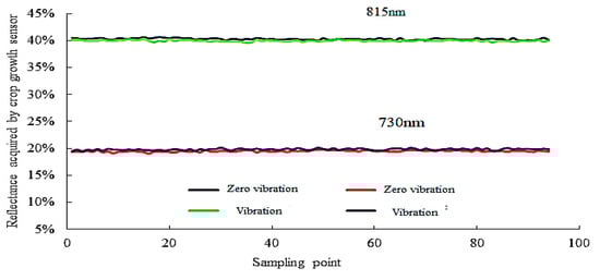 The variation curves of spectral reflectance plotted according to the data acquired by the spectral sensor at two different wavelength bands in the experiment conducted to investigate the impact of stationary vibration on the performance of the vehicle-mounted sensor in measuring spectral reflectance are shown in Figure 11. The values of average, variance, and CV corresponding to the 815 nm and 730 nm wavelength bands are shown in Table 4. It can be seen from the figure and table that the reflectance curves obtained at the 815 nm and 730 nm wavelength bands when the spray vehicle Is stationary are roughly consistent with their counterparts obtained when the spray vehicle is moving. At the wavelength band of 815 nm, the differences between the values of average, variance, and coefficient obtained under the condition of stationary vibration and those obtained under the condition of in-travel vibration are 0.24%, 0.03%, and 0.07%, respectively; the differences are 0.26%, 0.01%, and 0.03%, respectively, at the wavelength band of 730 nm.