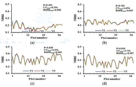 The variation curves of rice canopy NDRE were plotted according to the data acquired by the vehicle-mounted crop growth sensor in different crop growth stages under different traveling speeds in the experiment conducted to investigate the impact of in-travel vibration on the performance of the vehicle-mounted sensor in measuring spectral reflectance are shown in Figure 12. It can be seen from the figure that the values of significant difference P of rice canopy NDRE obtained under three traveling speeds are 0.454, 0.703, 0.810, and 0.838, respectively, for the four growth stages; the Cvmax values are 8.3%, 4.6%, 3.7%, and 3.6%, respectively, for the four growth stages; and the RMSEmax values are 0.008, 0.007, 0.007, and 0.008, respectively, for the four growth stages. The experimental results show that the vehicle-mounted crop growth monitoring system proposed in this paper can significantly mitigate the impact of vibration of agricultural machinery on the monitoring performance of the vehicle-mounted crop growth sensor, and the monitoring performance of the vehicle-mounted crop growth sensor is quite stable.