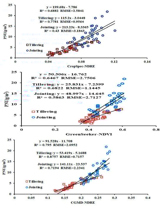 Considering that the NDRE values acquired by the GreenSeeker sensor in the booting and heading stages of rice crops tend to saturate, we compared and analyzed the fitting results of the NDRE values acquired by different sensors in the tillering, jointing, and tillering and jointing stages of the rice crop and the plant nitrogen uptake (PNU) values of the rice crop in the corresponding growth stages. As can be seen from Figure 13, the R2 values obtained by the CGMD, CropSpec, and GreenSeeker sensors in the tillering stage are 0.8757, 0.7781, and 0.6822, respectively, and the RMSE values are 0.7157, 0.9564, and 1.1445, respectively; the R2 values in the jointing stage are 0.7194, 0.43, and 0.5863, respectively, and the RMSE values are 2.2341, 3.1843, and 2.7127, respectively; the R2 values in the tillering and jointing stage are 0.795, 0.6882, and 0.6467, respectively, and the RMSE values are 2.0952, 2.5841, and 2.7506, respectively. The results show that the proposed crop growth monitoring system can accurately monitor the growth of rice.