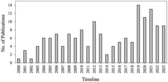 Figure 1. Publication trends in silvopasture research within the United States from 2000 to 2023, encompassing peer-reviewed journal articles, dissertations, theses, and conference proceedings.