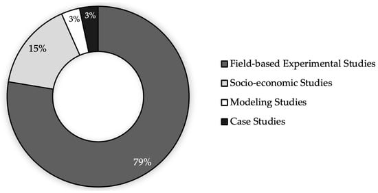 The increasing number of U.S. research publications on silvopasture by year from 2000 to 2023 highlights the growing interest in these systems and recognition of their potential benefits (Figure 1). These 152 published research works were also categorized based on the methodological approach used for the study and were parsed into four different categories (Figure 2) including the following: