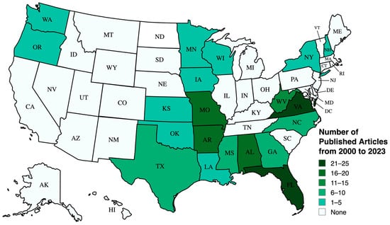 Figure 3. Geographical distribution of silvopasture research in the United States, illustrating the number of studies (including peer-reviewed journal articles, dissertations, theses, and conference proceedings) conducted in each state from 2000 to 2023.