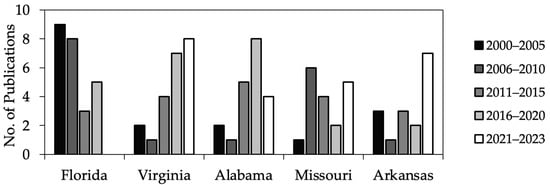 Figure 4. Trends in silvopasture publications by the top five states, segmented into five-year intervals from 2000 to 2023.