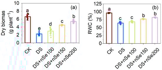 Effect of nSe on above-ground biomass (a) and relative water contents (b) of soybean after 12 days (R3) of drought stress imposed at R2 stage. The different treatment groups were control (Ck), drought stress (DS), drought stress + 100 mg L−1 nSe (DS + nSe100), drought stress + 150 mg L−1 nSe (DS + nSe150), and drought stress + 200 mg L−1 nSe (DS + nSe200). Different letters indicate significant differences (Tukey’s test, p ≤ 0.05).