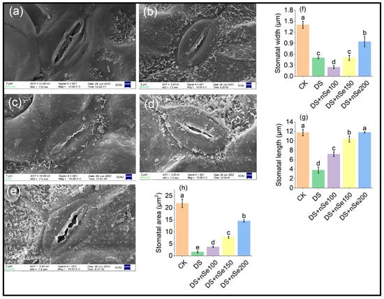 SEM observation of leaf epidermal surface and stomatal parameters of soybean at R3 stage under drought stress in response to different concentrations of nSe. (a) CK, (b) DS, (c) DS + nSe100, (d) DS + nSe150, and (e) DS + nSe200. (f) stomatal width, (g) stomatal length, and (h) stomatal area. The different treatment groups were control (Ck), drought stress (DS), drought stress + 100 mg L−1 nSe (DS + nSe100), drought stress + 150 mg L−1 nSe (DS + nSe150), and drought stress + 200 mg L−1 nSe (DS + nSe200). Different letters indicate significant differences (Tukey’s test, p ≤ 0.05).