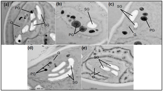TEM observation showing the ultrastructural alteration of leaf chloroplast organelles of soybean at R3 stage under drought stress in response to different concentrations of nSe. (a) CK, (b) DS, (c) DS + nSe100, (d) DS + nSe150, and (e) DS + nSe200. The different treatment groups were control (Ck), drought stress (DS), drought stress + 100 mg L−1 nSe (DS + nSe100), drought stress + 150 mg L−1 nSe (DS + nSe150), and drought stress + 200 mg L−1 nSe (DS + nSe200). SG; starch grain, PG; plastoglobuli, G; grana.
