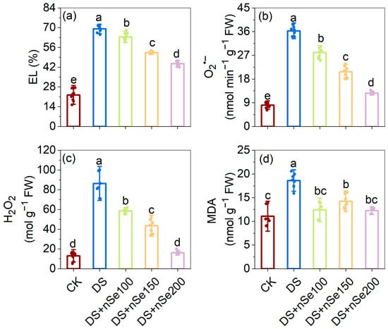 Effect of various concentrations of nSe on electrolyte leakage (a), superoxide content (b), hydrogen peroxide content (c), and MDA content (d) in leaves of soybean at R3 stage under drought stress. The different treatment groups were control (Ck), drought stress (DS), drought stress + 100 mg L−1 nSe (DS + nSe100), drought stress + 150 mg L−1 nSe (DS + nSe150), and drought stress + 200 mg L−1 nSe (DS + nSe200). Different letters indicate significant differences (Tukey’s test, p ≤ 0.05).