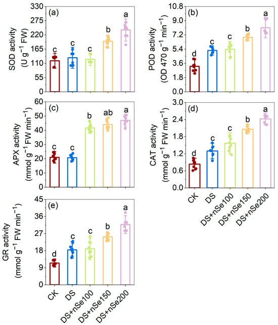 The results indicated that the foliar application of nSe treatments augmented the antioxidant enzyme activities of the drought-stressed plants compared to CK (Figure 5a–e). For example, DS-alone treatment slightly induced the activities of POD (68%), CAT (55%), and GR (60) compared to the CK plants. However, no significant modulation was found in the activities of SOD and APX enzymes compared to the control. Foliar application of nSe150 and nSE200 to drought-stressed plants significantly augmented the activities of these antioxidant enzymes. The high-dose nSe (nSe200) treatment on drought-stressed plants significantly increased the activities of all these enzymes. Importantly, no significant differences in enzyme activities were observed between the DS treatment and the low-dose (100 mg L−1) nSe treatment except APX activity (Figure 5a–e).