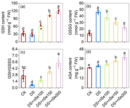 In response to drought stress, the impact of nSe treatment on the glutathione pool (GSH, GSSG, and ASA) was evaluated (Figure 6a–d). Compared to the CK, plants experiencing drought exhibited a decrease in reduced glutathione (GSH) and an increase in oxidized glutathione (GSSG) in soybean shoot tissue. Additionally, the GSH/GSSG ratio was lower under DS compared to other treatments. nSe treatment resulted in an increase in GSH content, along with the GSH/GSSG ratio, and a decrease in GSSG content compared to the drought treatment. Furthermore, ASA content increased slightly under DS compared to the CK treatment (Figure 6d). However, spraying with nSe dose-dependently increased ASA content in soybean shoots compared to both the CK and DS treatments. Notably, a higher concentration of nSe had a more positive effect on the glutathione pool than a lower concentration in drought-stressed plants.