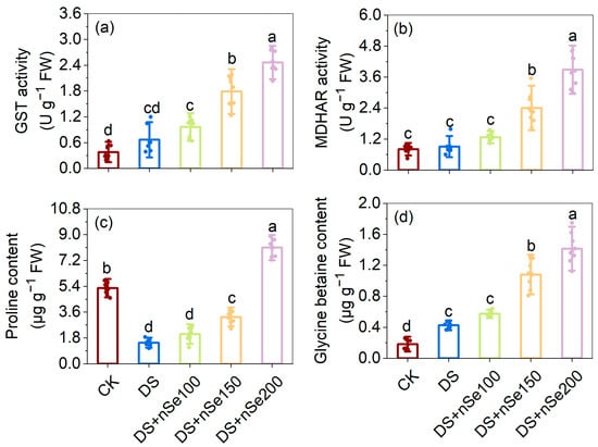 Effect of various concentrations of nSe on glutathione S-transferase activity (a), monodehydroascorbate reductase activity (b), proline content (c), and glycine betaine content (d) in leaves of soybean at R3 stage under drought stress. The different treatment groups were control (Ck), drought stress (DS), drought stress + 100 mg L−1 nSe (DS + nSe100), drought stress + 150 mg L−1 nSe (DS + nSe150), and drought stress + 200 mg L−1 nSe (DS + nSe200). Different letters indicate significant differences (Tukey’s test, p ≤ 0.05).