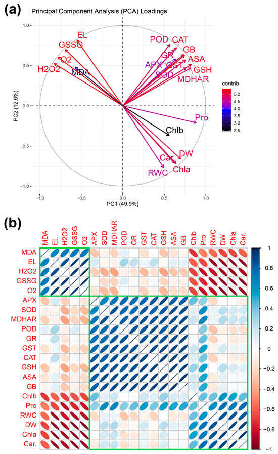 Loading plot for the first two principal components in the principal component analysis (PCA) for 21 measured traits of soybean tissue (a). Pearson’s correlation analysis of the measured parameters under drought stress in response to foliar application of nSe treatment (b). Color scale from light green to dark red shows negative correlation, while green to dark blue shows positive correlation.
