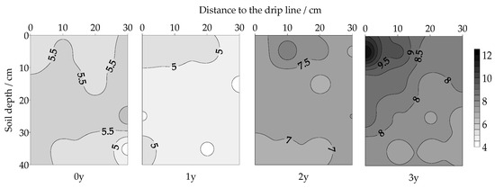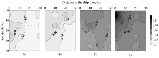 In soils of 0 y, SOM varied within 0.5 g·kg−1 and was randomly distributed in the soil profile (Figure 7). In soils of 1, 2, and 3 y, SOM decreased radially from the area around the drip line and so did its gradient, especially close to the drip line. This indicated that the distribution of SOM, similar to distributions of TN and TP, was mainly formed during the first growing season, and the effects of the planting year on SOM were shown in the increment of SOM content and its gradients in the soil profile.