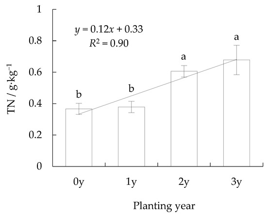 The average TN of the soil profile increased with the planting year (Figure 3). During the first growing season, TN increased slightly; however, in soils of 2 y, TN was larger than for 1 y and increased by approximately 60%; during the third planting year, the increment was less and TN increased by only approximately 0.07 g·kg−1 (i.e., 11.9% of 2 y). Differences between 0 y and 1 y and between 2 y and 3 y were not significant (p < 0.05), while the differences between 0 y and 1 y and between 2 y and 3 y were significant (p < 0.05).