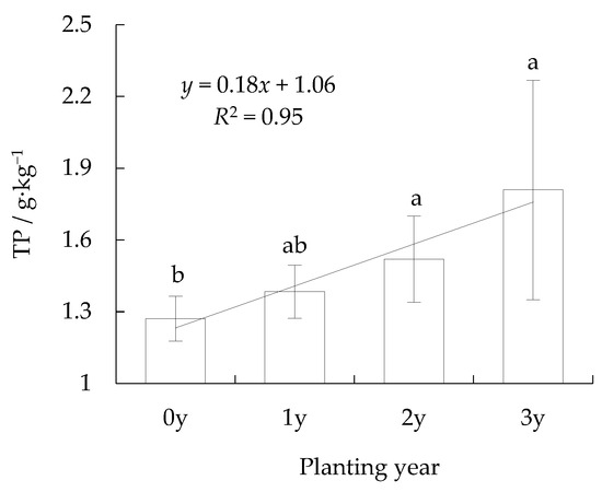 Changes in average TP of soil profile within planting year (in the fitted function, dependent variable y is the value of corresponding TP and independent variable x stands for planting year; x = 0, 1, 2, 3, 4). Different letters on the error line mean significant correlation at the 0.05 level of probability (bilateral). Error bars indicate standard deviation and specify sample size n = 9.