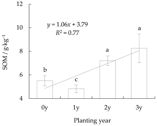 Changes in average SOM of soil profile within planting year (in the fitted function, dependent variable y is the value of corresponding SOM and independent variable x stands for planting year; x = 0, 1, 2, 3, 4). Different letters on the error line mean significant correlation at the 0.05 level of probability (bilateral). Error bars indicate standard deviation and specify sample size n = 9.