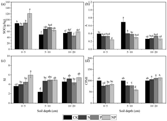 3.2. Response of SOC and C Pool Lability and SI and CPMI after Long-Term Fertilization in Different Soil Layers