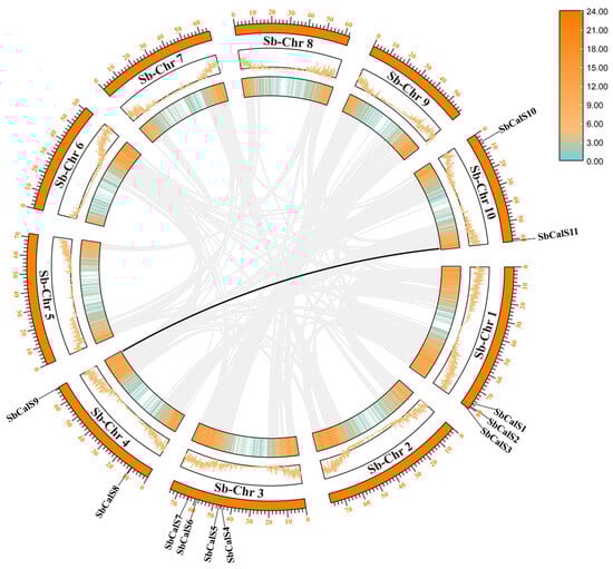 3.2. Chromosome Localization and Intraspecific Colinear and Ka/Ks Analysis of SbCalS Gene Family