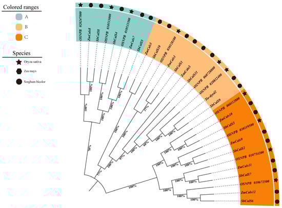 3.6. Analysis of SbCalS Interspecific Covariates and Phylogenetic Trees