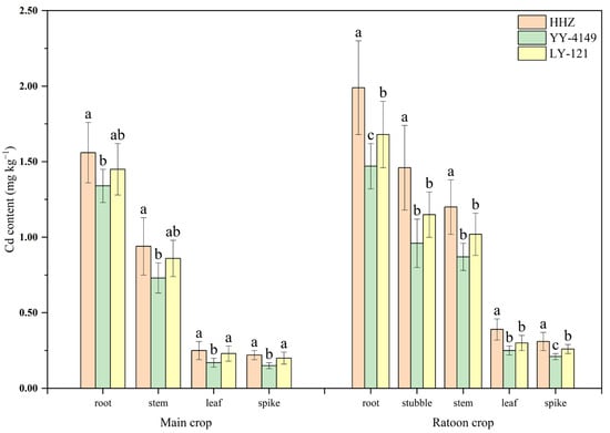 The rank-order of the Cd content in various plant parts (root, stem, leaf, spike, and stubble) in the main and ratoon crops of the tested cultivars was as follows (Figure 1): HHZ > LY-121 > YY-4149. The Cd content in each part of HHZ was significantly higher than that of YY-4149. In the main crop, the Cd contents in root, stem, leaf, and spike of HHZ were, respectively, 20.02%, 34.29%, 47.06%, and 46.67% higher than the corresponding contents of YY-4149. For the ratoon crop, the Cd contents in root, stubble, stem, leaf, and spike of HHZ were, respectively, 35.37%, 52.08%, 37.93%, 55.78%, and 47.62% higher than the corresponding contents of YY-4149.