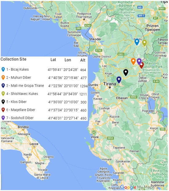 Seven accessions of red oregano (Origanum vulgare subsp. vulgare) were sourced from the Albanian GenBank, originating from seven distinct geographic locations across Albania following the FAO regulation rules [27] (see Figure 1).