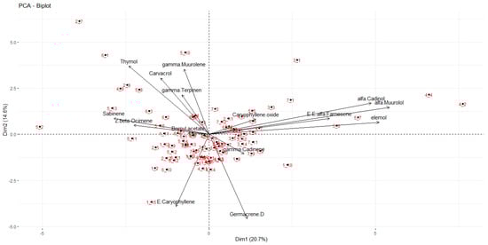 Principal component analysis (PCA) was undertaken to unravel the variance distribution among the variables. Our statistical analyses were directed explicitly toward oil components whose concentrations exceeded 0.5% of the total oil content, providing insights into essential oil composition variations. The contents of the 15 selected essential oil compounds differed significantly (p < 0.05) between the populations collected at different sites (Figure 2). The horizontal axis of the PCA accounted for 14.6% of the total variance, while the vertical axis contributed an additional 20.7 (refer to Figure 2). PC1 and PC2, the first two principal components, collectively elucidated 35.3% of the total variance. Figure 2 visually depicts the relationships among the variables on the PCA plot, with PC1 represented along the x−axis and PC2 represented along the y−axis. A principal component analysis (PCA) of data on the 13 significant compounds of essential oils in five oregano populations was previously conducted [21]. The analysis identified three principal components with eigenvalues exceeding 1, collectively explaining 96.5% of the total variation.