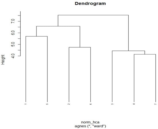 Dendrogram obtained via hierarchical cluster analysis (HCA) based on the Euclidean distance between the groups of essential oils of seven different populations of red oregano.