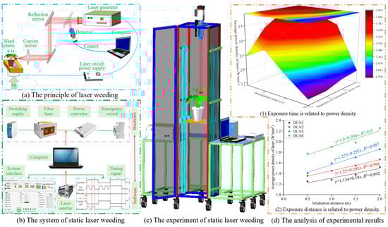 A robust method has been developed for evaluating the effectiveness of using laser patterns over green biomass that deliver preliminary results on pattern and speed effect. Research on laser weeding to date has primarily focused on early growth stage weeds and the ability of this approach to control larger weeds remains unknown. This article investigates the impact of a 500 W, 1080 nm fiber laser as a non-contact tool for the control of larger weeds in farmland and orchards. As shown in Figure 2, the study specifically designed a static laser weeding device and its system and explored the energy required to cut four common larger weeds (Chenopodium album, Amaranthus spinosus, Setaria viridis, and Eleusine indica).
