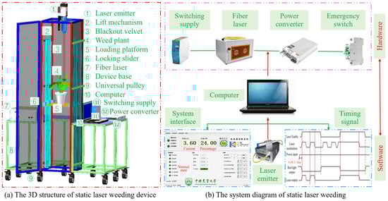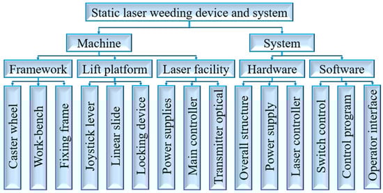 The effect of the laser beam on the weed plants depends on physical parameters (e.g., laser wavelengths, beam diameters, and doses) [17,18] and biological factors (e.g., plant species, plant size, and developmental stage) [15,19,20]. These factors may also be crucial for the effect of laser beams on non-target organisms and should be investigated. It is possible to quantify the cutting of plant stems by a laser beam in contrast to mechanical cutting. Therefore, this study aimed to design and test in the laboratory a novel prototype laser weeding device and system, along with its possibility and feasibility. Firstly, a static movable lift-adjustable closed laser weeding device and system have been constructed using the principles of fiber laser and mechanical modular design theory. The core working components were mainly divided into two parts: machine and system. The structure of the static laser weeding device and system is shown in Figure 3. The mechanical structure comprised three substructures, a framework, a lift platform, and a laser facility system, and the laser weeding system comprised mainly hardware and software.