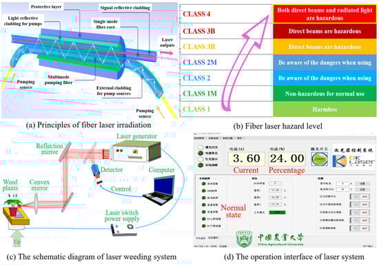 The laser is an optical instrument that can provide monochromatic coherent light via optical amplification using the stimulated emission of electromagnetic radiation [21]. The laser is powered by electricity and can reduce CO2 emissions compared to commonly used thermal weed control methods. The common practice of chemical and mechanical weed control can alter the soil structure or properties of most farmland, with the risk of affecting non-target organisms and the environment negatively [22,23]. In most cases, fiber lasers with a wavelength of 1080 nm are used. Their spectral characteristics are more suitable for plant crops and can be configured for high-power applications. As shown in Figure 4a, the fiber laser usually consists of an energy source, a protective layer, a pumping fiber, and a single-mode fiber core. From preliminary studies on laser weeding doses [24,25], a single-mode continuous fiber laser (DK-YSM 500, HUNAN DK LASER CO., LTD., Yueyang, China) was chosen, and the fiber laser system properties are listed in Table 1. The laser output power was varied via pulse modulation; the laser was more stable in the middle of its performance range rather than towards the limits of its range.