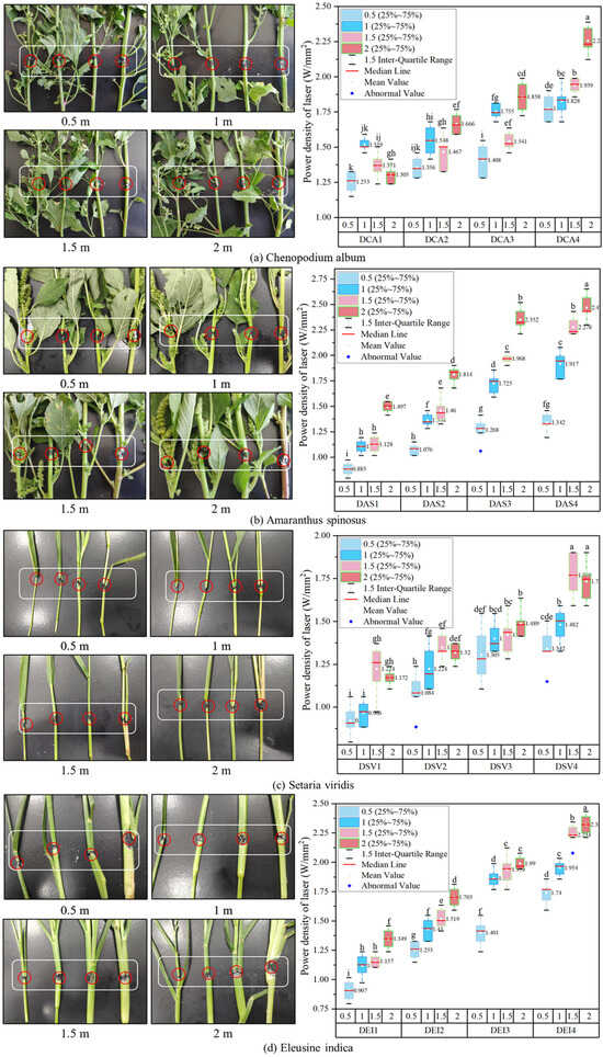 As shown in Figure 8, the stem diameters of the four weeds Chenopodium album, Amaranthus spinosus, Setaria viridis, and Eleusine indica were cut off under the laser irradiation of 10 s, and there were still burning marks in the combustion area. According to the experimental results under different irradiation distances and diameters of stems, the variance in the stem power density after irradiation was larger and the values were more dispersed for Chenopodium album and Setaria viridis weeds, and the values were relatively scattered, while the power density values of Amaranthus spinosus and Eleusine indica weeds were more concentrated.