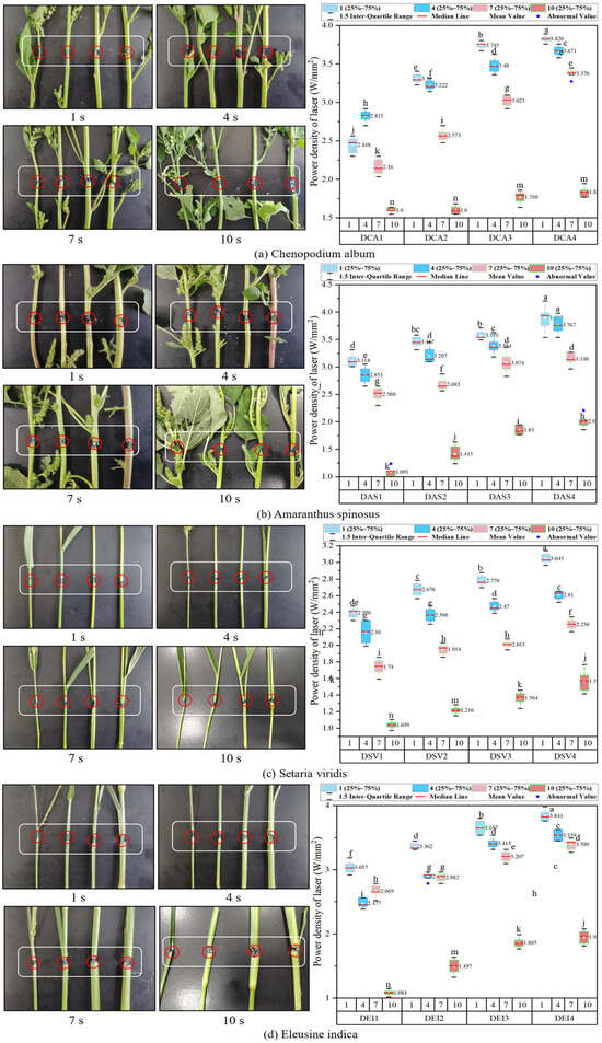 As shown in Figure 9, under the same irradiation distances, the energy required to cut the same type of weed generally increases with the increase in stem diameter and the decrease in irradiation time, which is inversely proportional to the time emitted by the laser. The variance in the power density after the irradiation of the four weeds was relatively small, and the values were more concentrated. The largest diameter of the stems was burned in the shortest time of 1 s and required the most power density, with average values of 3.826, 3.892, 3.045, and 3.841 W/mm2, respectively. The smallest diameter of the stems was burned in the longest irradiation time of 10 s and required the least power density, with average values of 1.6, 1.091, 1.039, and 1.084 W/mm2, respectively. After comparison, it was found that at the same irradiation time, the power density of the stems between the existence of significant differences (p < 0.05), indicating that changes in the diameter of stems have an impact on the power density of laser irradiation, and the power density increases significantly with the increase in stem diameters. There was no significant difference between the overall laser irradiation time and power density (p > 0.05), indicating that the changes in laser irradiation time have a relatively small impact on the power density of laser irradiation, and the power density increases insignificantly with the increase in irradiation time. However, the difference in the laser irradiation time is not very significant when the stem diameters are very small, possibly due to the slender stems, which consume less laser energy. The adjustment accuracy and range of laser power and irradiation time are not precise enough, and the difference in irradiation time is not very obvious. Finally, under the same irradiation distances, the four weeds consumed the least energy at the irradiation time of 10 s, and the difference between them was not significant, with a significant difference from the results at irradiation times of 1, 4, and 7 s.
