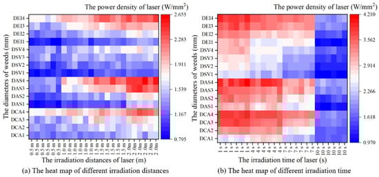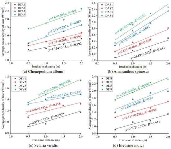 To better study the static operation rules of laser weeding devices indoors, comprehensive comparison experiments were applied at different stems using the laser with different irradiation distances and time. The linear function relationship between the different stem parts of the four weed species under different irradiation distances was obtained, as well as the change tendency of the energy required for weed stems under different irradiation times. As shown in Figure 10, there is a linear relationship between the irradiation distance and the power density for the four weeds with stems of the same diameter. Actually, it is similar to the dose–response curve proposed in this article [14,34]. As shown in Figure 10a–d, the larger the diameter of the weed stem, the steeper the curve, indicating that laser energy consumption is also increasing [35,36].