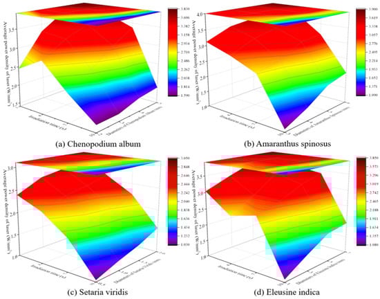 From the analysis results in Figure 10, Figure 11 and Figure 12, the Amaranthus spinosus consumed the least amount of energy for the shortest irradiation distances and stem diameters, and the most for the farthest irradiation distances and stem diameters at the same irradiation time. When Amaranthus spinosus was treated with the laser at different distances and stem diameters, the difference in energy required was the greatest, and the most significant changes were also observed. After comparison, under the same irradiation distances, the energy consumption of Setaria viridis at the longest irradiation time and stem diameter was the least among the four weeds, which may be related to it having the smallest stem diameter.