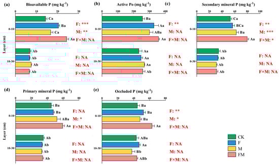 The concentration of (a) bioavailable P, (b) active Po, (c) secondary mineral P, (d) primary mineral P, and (e) occluded P at 0–10 and 10–30 cm in the control (CK), mow and fertilize (F), mow and manure (M), and mow fertilize and manure (FM) treatments in 2015. Mean ± standard error of three blocks. Different capital letters indicate significant differences between different treatments in the same soil layer, and different lowercase letters indicate significant differences between different soil layers in the same treatment. Two-way ANOVA results are shown in red. *** p ≤ 0.001, ** p ≤ 0.01, and * p ≤ 0.05. NA indicates no significant effect. F is for fertilizers, M is for manures, and F M is for the interaction of fertilizers and manures.