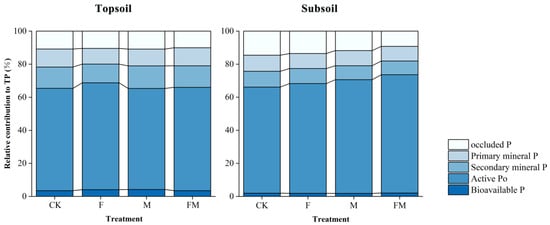 The proportion of bioavailable P, active Po, secondary mineral P, primary mineral P, and occluded P at 0–10 (topsoil) and 10–30 (subsoil) cm in the control (CK), mow and fertilize (F), mow and manure (M), and mow fertilize and manure (FM) treatments in 2015.
