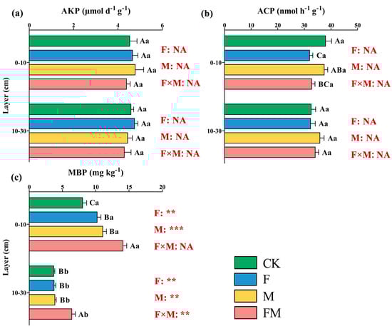 The concentration of (a) the activity of alkaline phosphatase (AKP), (b) acid phosphatase (ACP) and (c) microbial biomass phosphorus (MBP) treatments in 2015. Mean ± standard error of three blocks. Different capital letters indicate significant differences between different treatments in the same soil layer, and different lowercase letters indicate significant differences between different soil layers in the same treatment. Two-way ANOVA results are shown in red. *** p ≤ 0.001, ** p ≤ 0.01. NA indicates no significant effect. F is for fertilizers, M is for manures, and F M is for the interaction of fertilizers and manures.