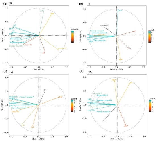 In the CK treatment (Figure 5), principal component 1 (PC1) explained 59.4% of the total variation, and principal component 2 (PC2) explained 19.8% of the total variation. SOM, TN, MBP, and AP are the key factors influencing the variation in bioavailable P, active Po, secondary mineral P, and primary mineral P. In the F treatment, PC1 explained 63.7% of the total variation and PC2 explained 15.6% of the total variation. SOM, TN, MBP, AP, and MBP are the key factors influencing the variation in soil phosphorus fractions. In the M treatment, PC1 explained 69.8% of the total variation, and PC2 explained 12.9% of the total variation. SOM, TN, MBP, AP, AKP, and ACP had a strong correlation with soil phosphorus fractions. In the FM treatment, PC1 explained 69.8% of the total variation and PC2 explained 12.9% of the total variation. SOM, TN, MBP, AP, and pH had a strong correlation with soil phosphorus fractions. On PC2, pH and BD are critical factors for AKP and ACP.