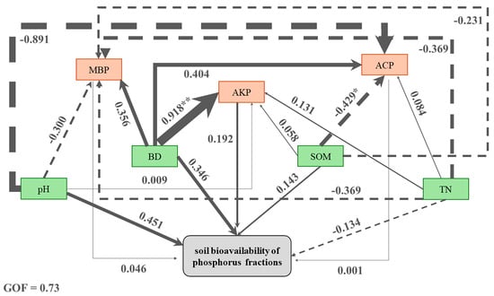 BD had a significant positive effect on AKP (Figure 6). SOM had a significant negative effect on ACP. pH has a strong negative effect on ACP. TN has a strong negative effect on MBP. pH and BD each had strong positive effects on the soil bioavailability of phosphorus fractions. BD had a strong positive effect on MBP and ACP.